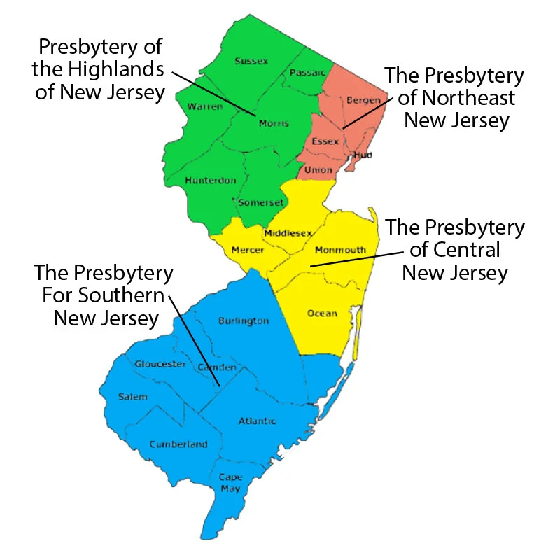 On March 1st the General Assembly Administrative Commission on Mid Councils approved the reorganization of the seven New Jersey Presbyteries into four new missional communities. This action was no simple merger of whole presbyteries. Instead, it was a carefully crafted plan created by two separate working groups of representatives across the state working in tandem with their presbyteries. Last fall all seven presbyteries voted to approve the plan which brought together churches from as many as four presbyteries to create brand new communities. Since the vote transition teams were formed with people from what would become the new presbyteries to begin to put together their new ways of being missional and operating. This has been a chance to reimagine what it means to live together in community in service to God. While each presbytery will take a different shape based on the goals and dreams of the presbytery members, there will be a concerted effort made to share resources and services across presbyteries or across the state wherever possible.