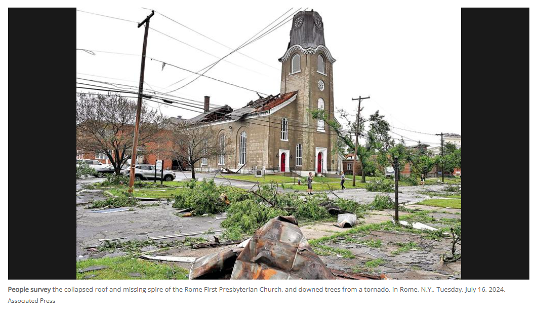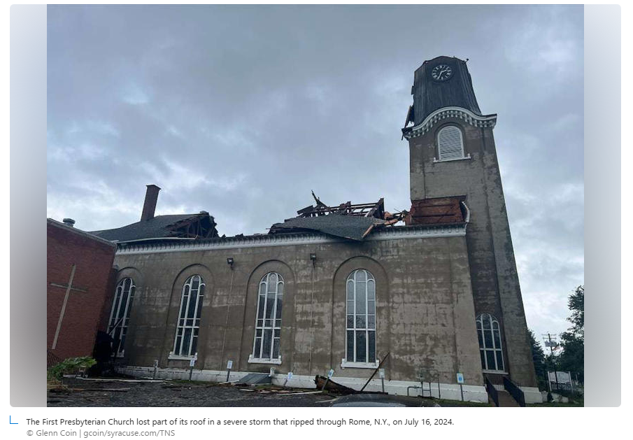 This week a tornado struck Rome and Canastota, NY within the Presbytery of Utica. Presbytery Leader Larry Beasley sent the message below concerning the details we pass on to the synod community. Please keep the church, Rome and Canastota in your prayers and consider ways your presbyteries, churches, or individuals can reach out and come to the First Presbyterian Church of Rome’s aid.