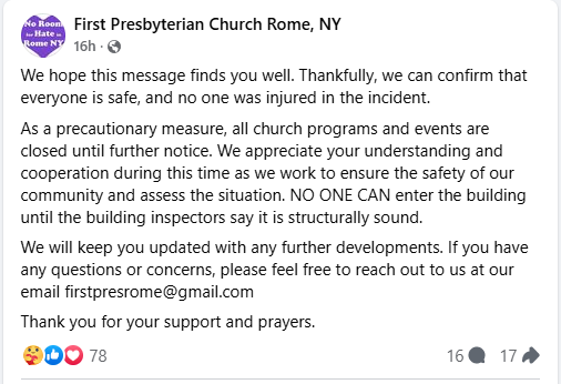 The sanctuary of the First Presbyterian Church of Rome and many buildings in the area were destroyed. The Christian Education wing of the church also sustained severe damage. Structural engineers are on the site assessing the extent of the damage and how safe the building is. Congregations of the Presbytery of Utica are rallying to assist FPC Rome.