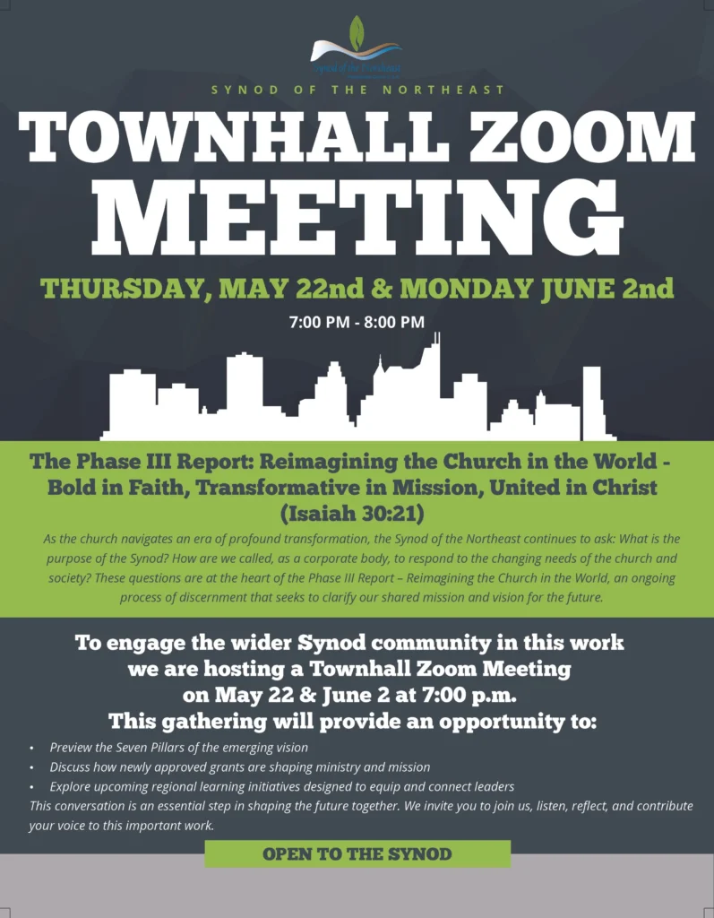 On April 22, the Synod Discernment Team hosted its first Town Hall, welcoming 42 participants from across our community. The gathering featured presentations from each of the Synod’s missional pillars, followed by a rich time of dialogue as attendees asked thoughtful questions and reflected on the work ahead. These Town Halls are part of our shared journey toward a renewed Synod vision. At the heart of this process are members of the Discernment Team, staff, Leadership Team, and conveners of the Mission and Ministries Commission—working diligently within their ministry areas to shape the future we are discerning together. As we continue through Eastertide, we are mindful that we live and lead amid chaos and uncertainty. And yet, the resurrection of Christ calls us to abundant hope. Our new vision is grounded in the deep belief that the Church is not dead—it is alive. This resurrection truth reorients us. It challenges us to ask: How does this reality change how we see the future? What if we dared to believe that new life is not only possible—but already breaking forth among us? We invite you to join this holy work. Upcoming Town Halls will be held on May 22 and June 2—registration information is provided below. Your presence and your voice matter. Together, we are listening for God’s call. We are discerning not only where we’ve been, but where the Spirit is leading us now. What future is God inviting the Church to embody? And how can we, as a Synod, help bring that vision to life? This work is especially meaningful as we live into our identity as a Matthew 25 Synod, rooted in justice, compassion, and bold faith. With Easter Hope,Rev. Ashley