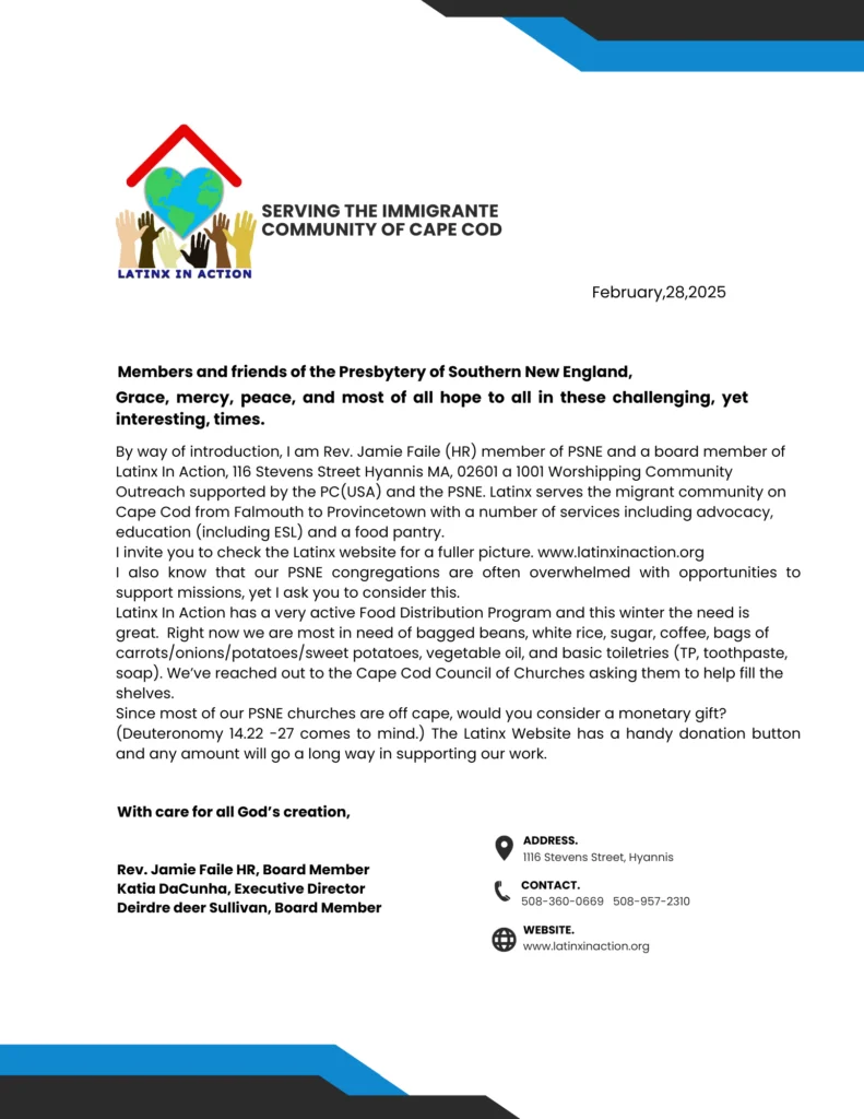 Presbytery of Southern New England working with Latinx in Action seeks donations for the migrant community of Cape Cod.
