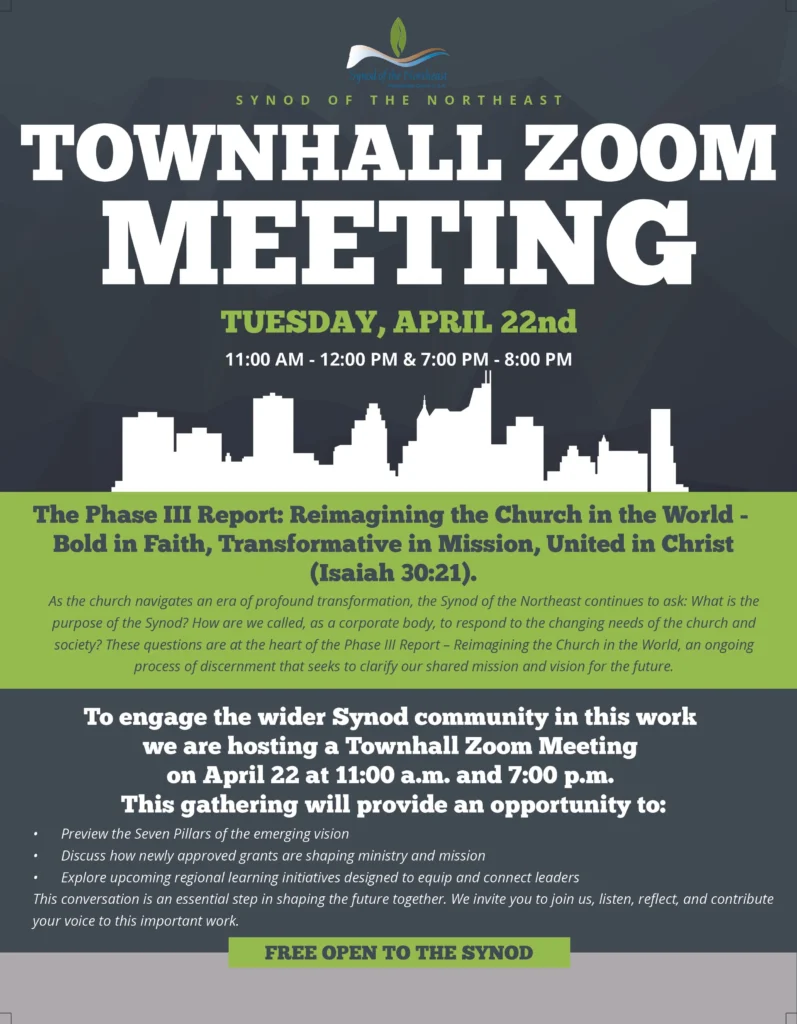 The Visioning Process is underway, with small groups working diligently to prepare their presentations for the Town Hall meeting scheduled for April 22. Each group is clarifying its future goals and developing clear quarterly objectives to present the proposed vision at the Synod meeting on November 15, 2025, at First United Presbyterian Church in Amsterdam, NY.