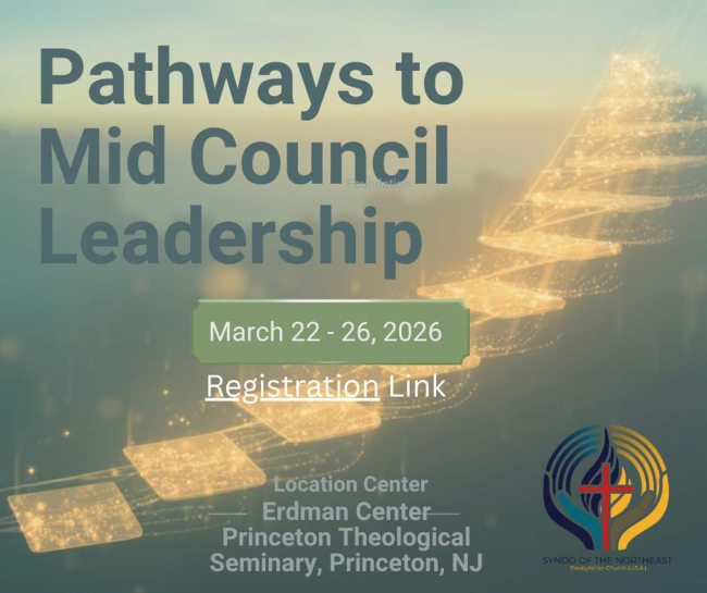 Pathways to Mid Council Leadership + Add to Google Calendar + iCal / Outlook export 00 days 00 hours 00 minutes 00 seconds SearchSearchRecent PostsBecoming What God Is Calling Forth: Lament, Truth, and a Hope That Refuses to Look Away Matthew 25 In Action: Roosevelt Marches in Hope | 3rd Annual MLK Day Unity March & Cultural Celebration SYNOD OF THE NORTHEAST GRANT MENTORSHIP INITIATIVE Wurffel-Sills Scholarship and Interest-Free Student Loan Application Matthew 25 In Action: Responding to Gun Violence with Prayer, Presence, and Practical Tools Recent Comments